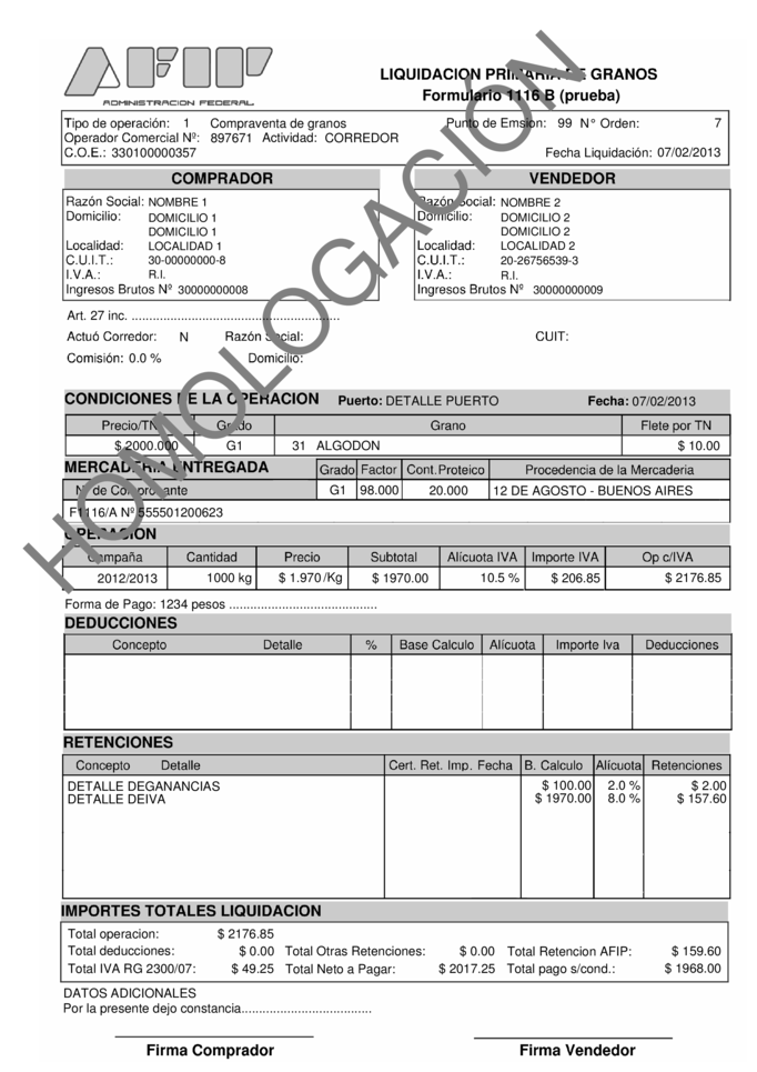 Formulario C 1116 B - Imagen Ejemplo - Liquidación Primaria de Granos (WLPG) - PyAfipWs