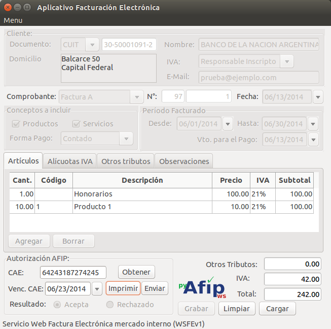 - Obtener CAE: autoriza la factura, completando el CAE y demás datos