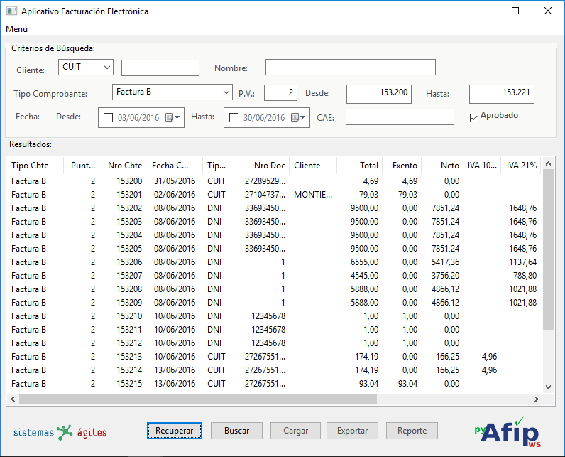 Para recuperar comprobantes registrados en AFIP, se debe seleccionar el tipo de comprobante, punto de venta y nro de comprobante (desde/hasta), como se muestra en la imágen. Dado que a AFIP no se informa los datos de cliente (nombre, dirección, etc.), se utiliza el padrón online para completar esos valores. Adicionalmente, como no se informa el detalle de los artículos, solo se muestran los subtotales por cada alícuota de IVA.