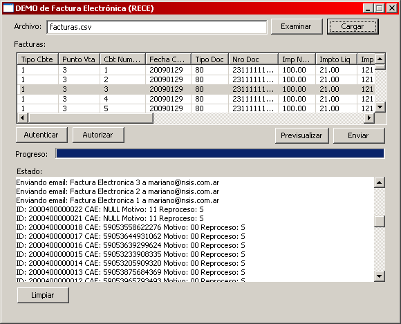 - Autorizar un conjunto de Facturas, ya sea por lote de facturas B o facturas A/B individuales, obteniendo CAE y demas valores